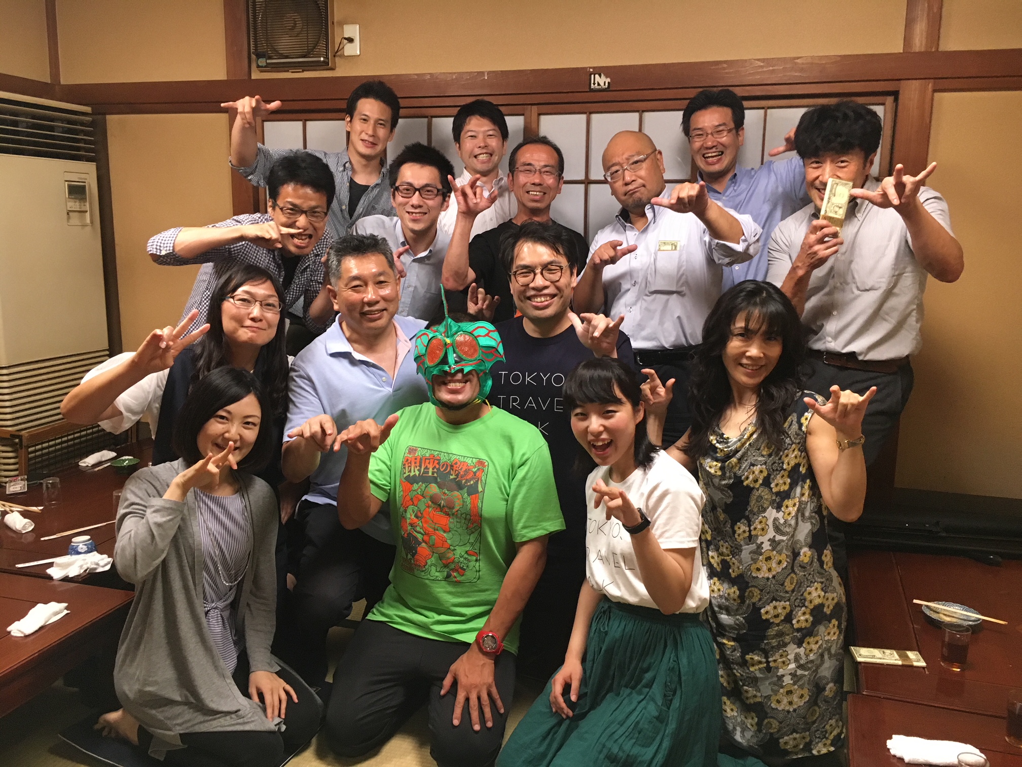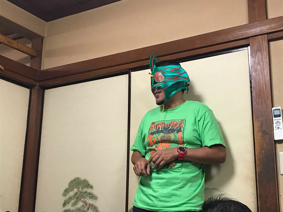 あ、いた。この人がツバ吉さんだ。一目見てそう思いました。だって、変な仮面をかぶっていたから。 「銀座の鉄人」と書かれた黄緑色のTシャツを着た、普通ではなさそうな人。でも、怖い、とは思わなかった。仮面を被っていても、きっと優しいオーラが滲み出ていたからかな。会場は既にほかの参加者の方のおかげで温まっていたので、私もほっとして腰を下ろした。私に話しかけてくれる人のおかげもあって、緊張の糸もほぐれてきたところで「旅するトーク」はスタート。