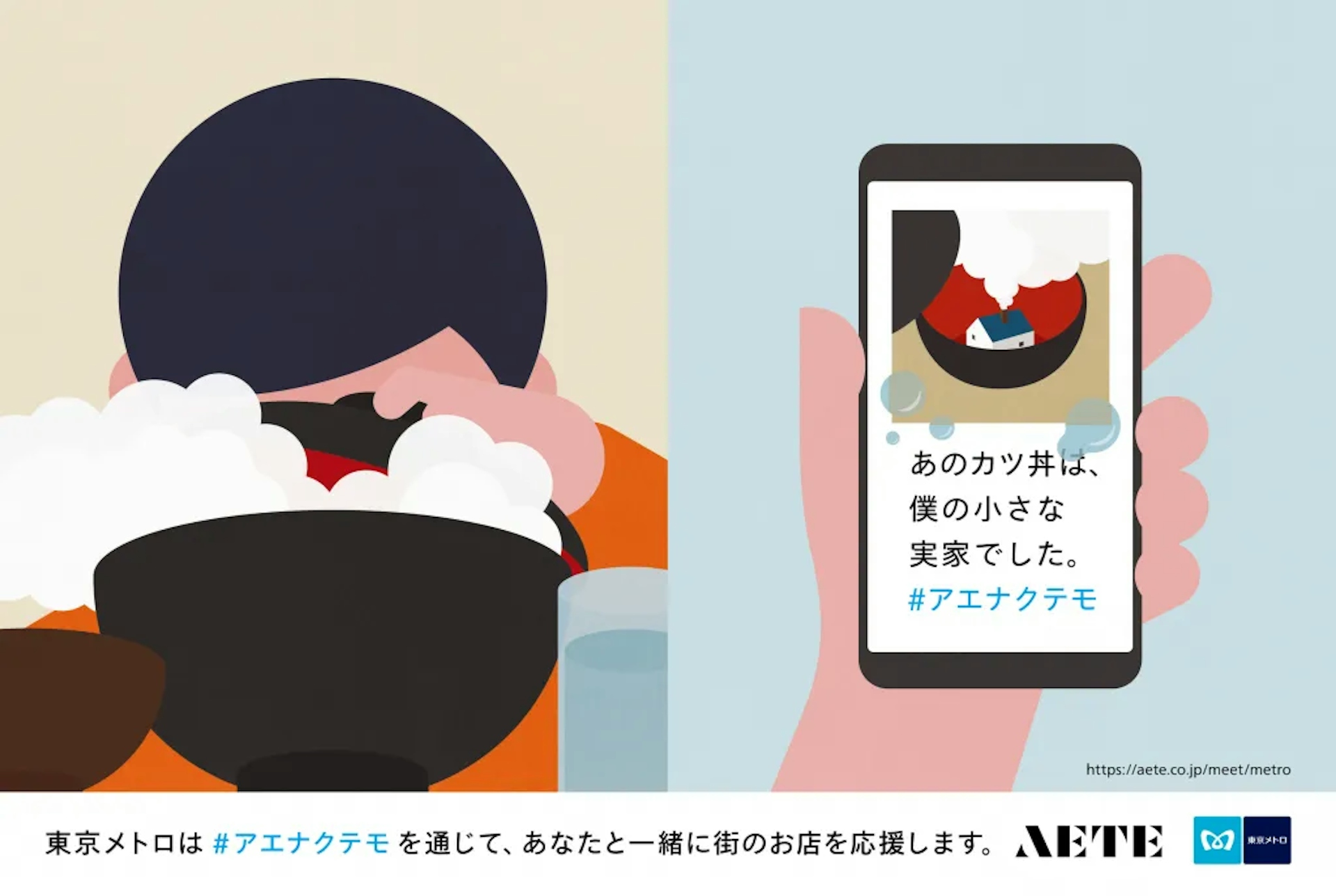 これまでに40以上の駅・街で『東京、旅するトーク』シリーズを初めとする様々な体験が行われ、4000名以上の新しい出会いと物語が生まれ、その数は増加傾向にありましたが、新型コロナウィルス感染予防対策として、直接「会う」ことが当たり前ではない環境が突然訪れ、東京に暮らす多くの人たちの生活に影響が出ています。 「アエナクテモ」キャンペーンは、そんな中でも暮らしを豊かにしてくれている街を彩る店舗(飲食店や個人営業のお店など)をSNS(Instagram/Facebook/Twitter)で思い出を添えて応援していただくと、AETE及び東京メトロの広告や媒体などでお店の情報が取り上げられ、あなたの応援や素敵なお店の情報がより多くの方に届く内容です。 以前はよく通っていたお気に入りのお店、そして今はテイクアウトやデリバリーでゆっくり話す機会がなくなっているお店などとの小さな思い出たちを、大きな声にして届けていきたいと思いますので、ぜひご参加ください。