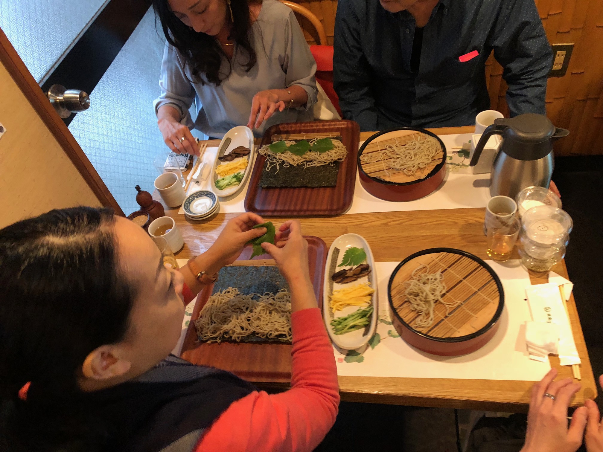 そして今回の旅するトーク、実は天野さんのお話だけに終わらない。 歴史やエピソード紹介がある程度終わると、天野さんはまた忙しそうに厨房の中へと入っていった。厨房の中をのぞくと、小さな台に小皿がたくさん。天野さんによると、どうやら次は、「そば寿司」づくりの体験をさせてもらえるようだ。 それにしてもあまりにも天野さんが大変そうなので、私もお手伝いをすることにした。実はわたし、普段パン屋でアルバイトをしているので接客には大変自信があった。今日はパン屋ではなく長寿庵の店員さんになりきって、本物の店員さんに負けない様にと一生懸命お盆に小皿を乗せて運んでいく。 「おねえちゃん、お水持ってきてくれない?」「これはどうやって食べるの?」 私があまりにもお蕎麦屋さんに溶け込んでいたからなのか、どうやら私はここで働いている人だと思われているようだ(笑)。東銀座のお蕎麦屋さんでまさかアルバイト体験ができるなんて夢にも思っていなかったけれど、気が付いたらものすごく楽しんでいることに気が付いた。