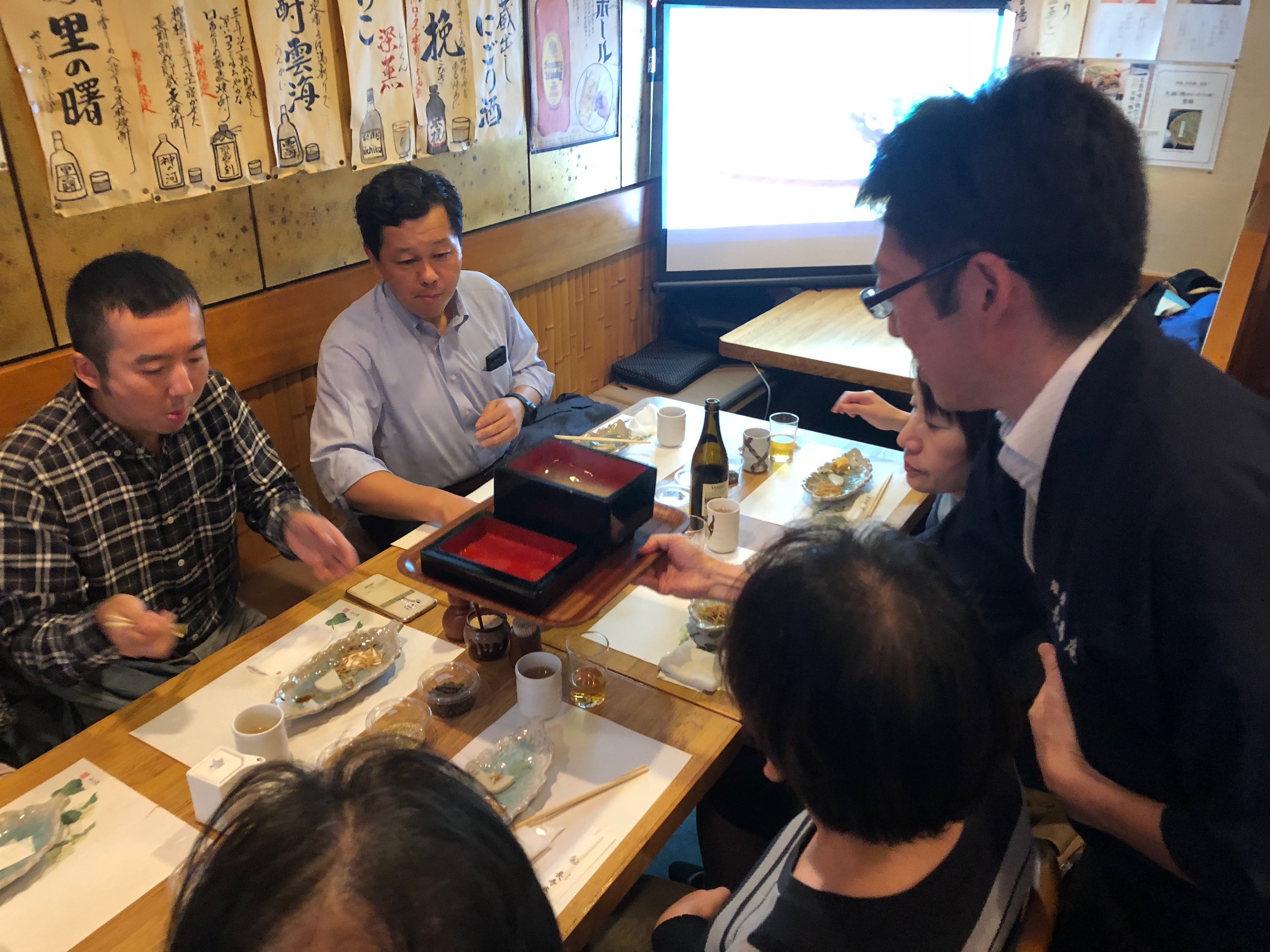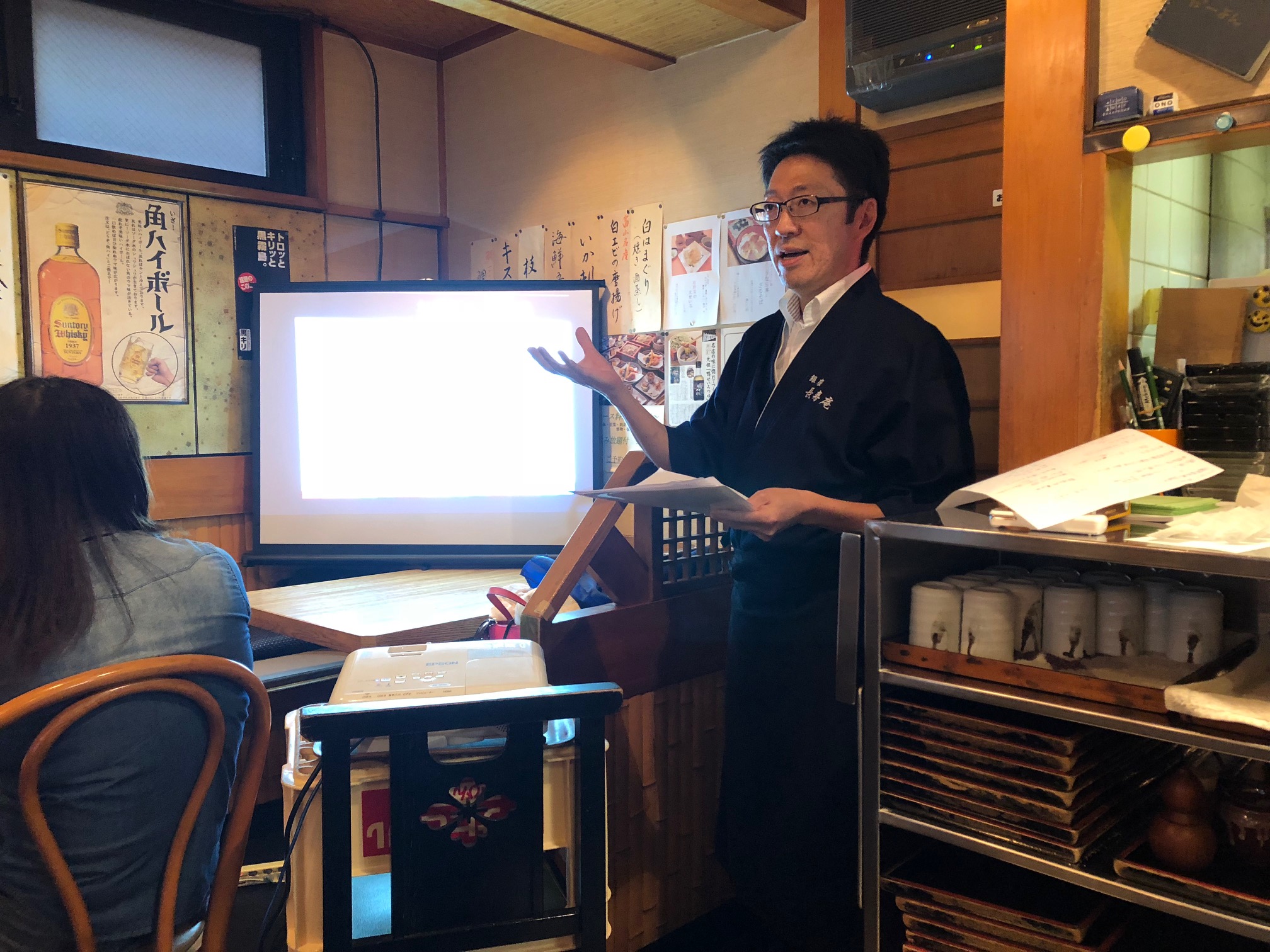 お蕎麦の由来、長寿庵の歴史、それから長寿庵が発祥だといわれている「鴨せいろ」の誕生秘話。スライドも用意してくださった天野さんの準備万全な説明に、参加者一同熱心に耳を傾ける。私も蕎麦は大好きなので、新しい発見があっただけでお蕎麦と私の距離がぐっと縮まったように感じる。それにしてもスライドに映る写真を見ただけでお腹が鳴ってくるなあ。…ああ、おいしそう。