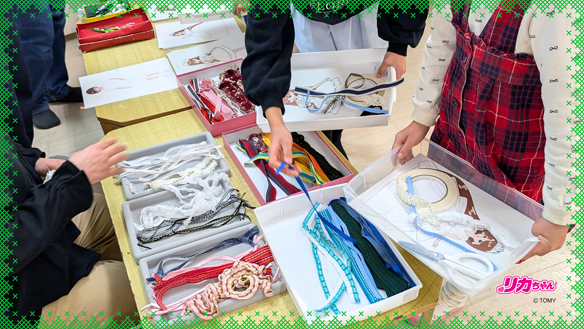廃棄予定の生地やリボンを使った専用キットで衣装を制作する過程で、子どもたちは素材の手触りを感じ、色を選び、手を動かすことに没頭していきます。「リカちゃん」というときめきに満ちた世界観も相まって、アップサイクルの意義は言葉で教えるのではなく、夢中になる体験そのものを通じて伝わっていく──そんなプログラム設計を行いました。