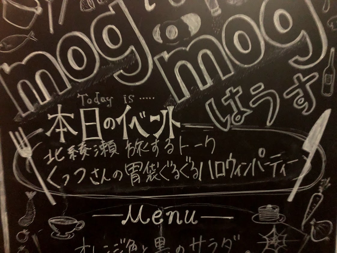 「welcome to mog mog」と書かれた素敵な看板が立っている。看板には、「北綾瀬旅するトーク『くっつさんの胃袋ぐるぐるハロウィンパーティ』」と書かれていた。 …くっつさん、って誰だろう? 家の中から聞こえる温かい声に促されて玄関へと足を進め、玄関の前で止まってから息を大きく吸う。 なんだかいつもと違う旅の会場にドキドキしてきた。お店やフリースペースとは違って、人のお家の玄関をあがるのはとても勇気がいるなあ。