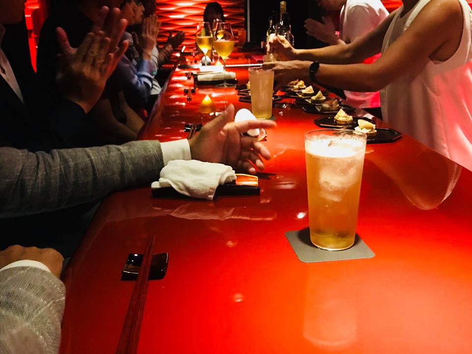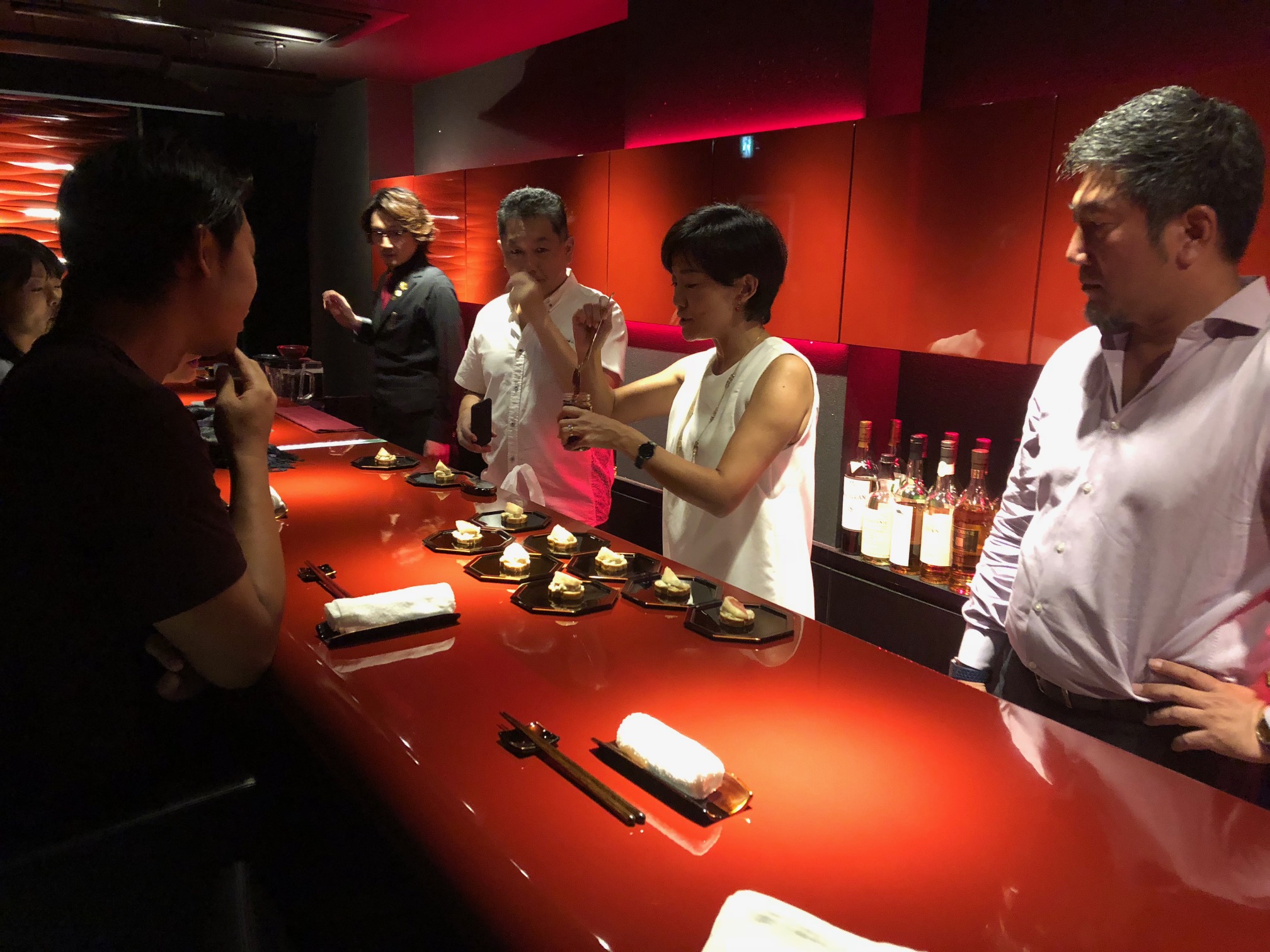 今回旅のトークをしてくださるのは、1919年創業の老舗、漆塗専門店「山田平安堂」の4代目・山田健太さん。ホストの和田野さんと山田さんは学生時代の先輩後輩の関係にあたり、今回の旅するトーク開催につながった。 そして今回の会場は、六本木の「He&Bar」(Heiando Bar)。小さなドアをカランコロンと開けてすぐ、びっくり。テーブル、お店の壁、全てが真っ赤な漆で覆われていたのだ。 実は今回の旅するトーク、応募が殺到し2回目の開催が決定していた(なんと3回目もこの後決まることに)。このお店がいかに普段から人気であるかが良くわかる。参加者の中にも、「1年以上待ってでも行きたいと思っていた」と話す方もいるほど。このように、常日頃からファンの多い素敵なお店で、今日は実際にこのお店を手掛けた方のお話が聞けるというのだから、とても豪華な旅のコンテンツである。なんだかわくわくしてきた。 それにしても、上京して3年、まだお酒を飲める年齢になって間もないこの私が六本木のバーにいるなんて、誰が想像していただろう。 まず山田さんの話を聴く前に驚いたことが1つ。それは参加者の皆さんがバーテンダーの方にオーダーする際、メニューも見ずにお酒の種類を伝えていたことだ。そういえば私、本物のバーテンダーさんも初めて見た。大人になるとメニューも見ずにお酒を頼むことが出来るようになるのだろうか。初めての光景ばかりで受け入れられないことばかり。さっきから私の目はずっと真ん丸なままだ。 バーはカウンター席だから、一人物思いにふけることもできるし、隣にいた人にこそっと話すこともできる。1人の時間も、また人との会話や距離の絶妙な間、なんていうのも大切にできる空間。これがきっと「大人」ということなんだろう…。
