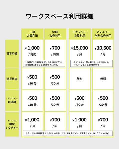 ・マンスリー料金:一般 ¥15,000/月 学割 ¥10,500/月