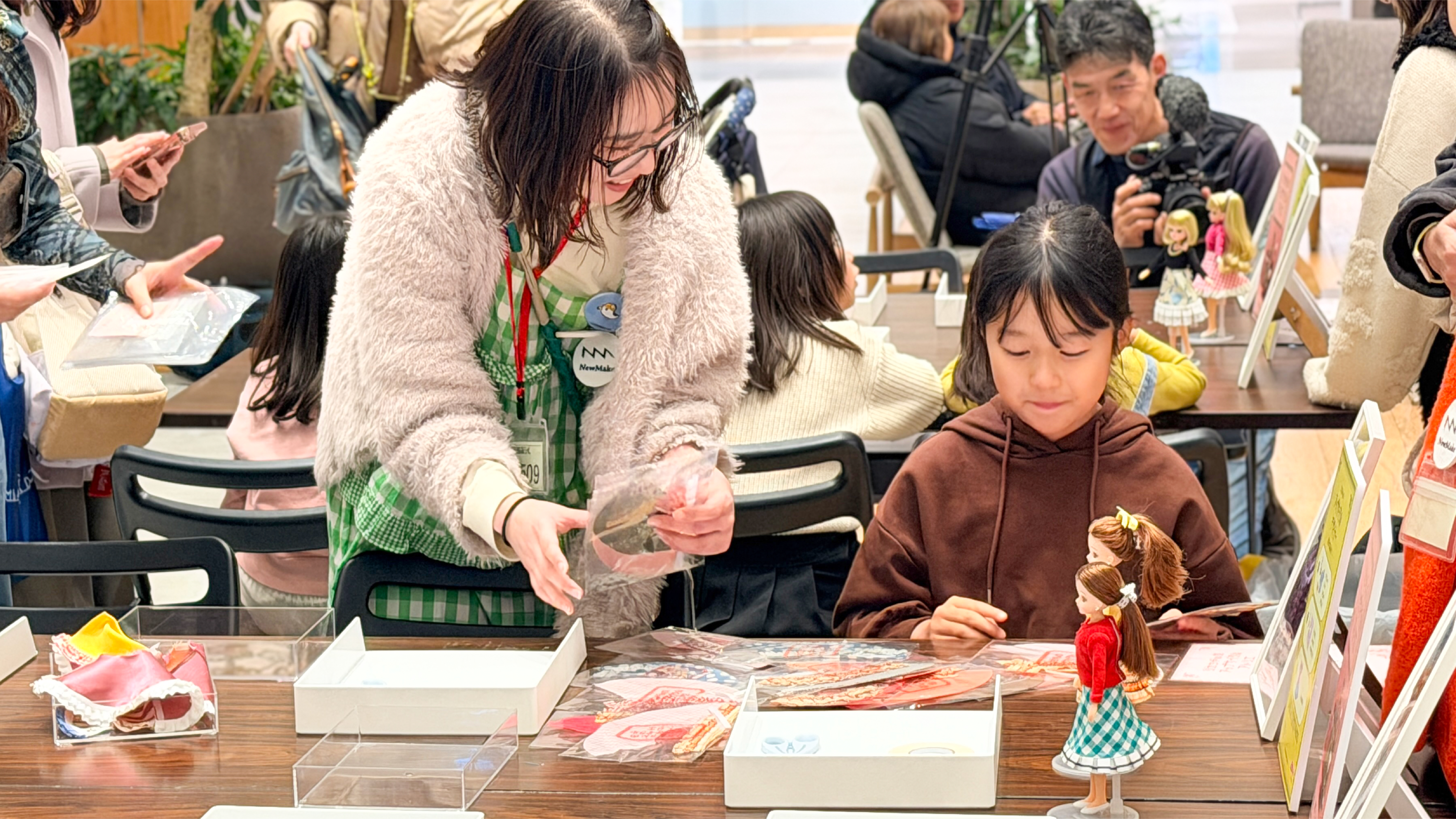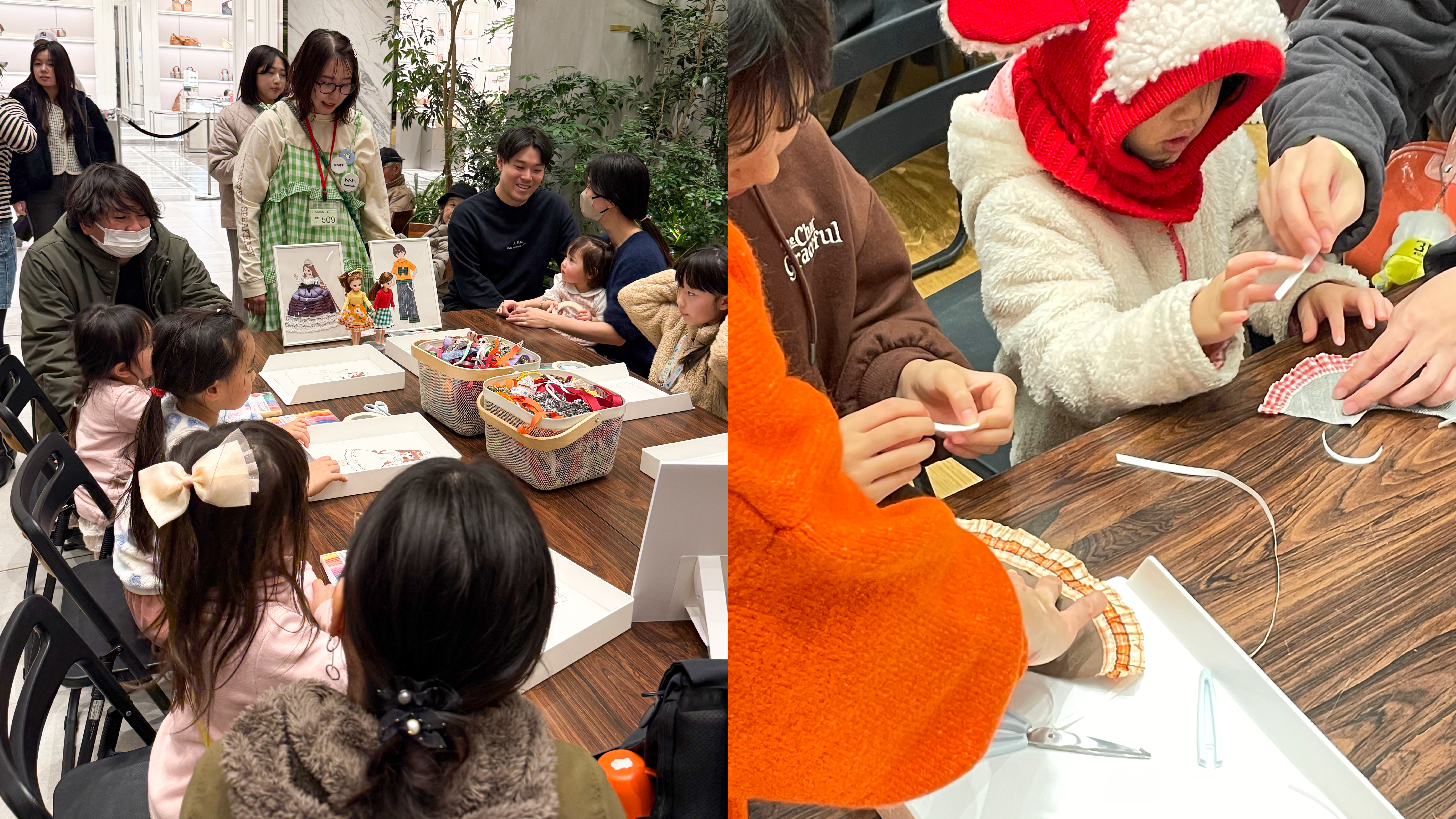 ワークショップでは、体験を通して素材の見え方が変化する場面も見られました。今回使用した布やリボンは、まだ十分に使える状態でありながら、廃棄される予定だった素材です。ワークショップの冒頭でスタッフがその背景を紹介し、これらの素材を使って作品づくりを行うことを参加者に伝えました。その後、撮影スタッフから「これは元々何だったかわかる?」と尋ねられた子どもが「ゴミ!」と答える場面もありました。しかしワークショップ終了後、同じ素材で作られたリカちゃんの衣装を前に、親子からは「捨てられなくてよかったね」という声が聞かれました。体験を通じて、素材の価値や見え方が変わる瞬間が生まれていました。