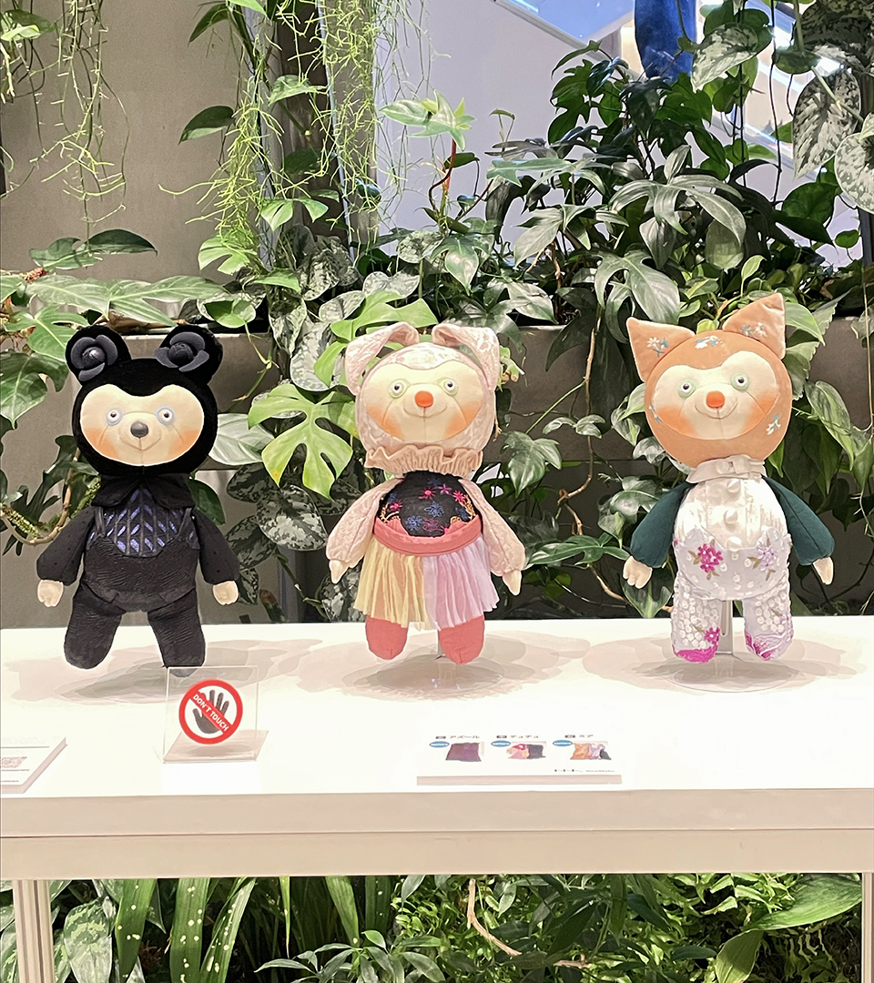 アップサイクルぬいぐるみブランド『Kireppa(キレッパ)』を展開する作者が、アパレルメーカーの服を再生し生まれ変わらせたぬいぐるみ達。袖の装飾をそのままぬいぐるみの首元に使うなど流用しながら、上質な布だからこそ実現する曲線的フォルムを生かしたデザインに仕上げています。