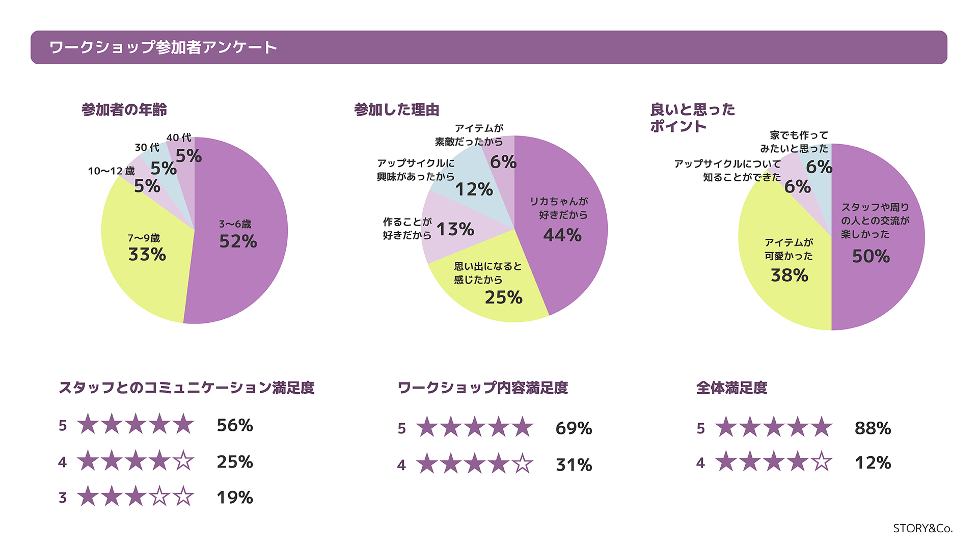 また参加者アンケートでは、全体満足度平均98%と非常に高い評価を得ました。参加理由として最も多かったのは「リカちゃんが好きだから」(44%)で、親しみのあるキャラクターを入口に体験へ導く設計が参加の動機につながっていることがうかがえます。